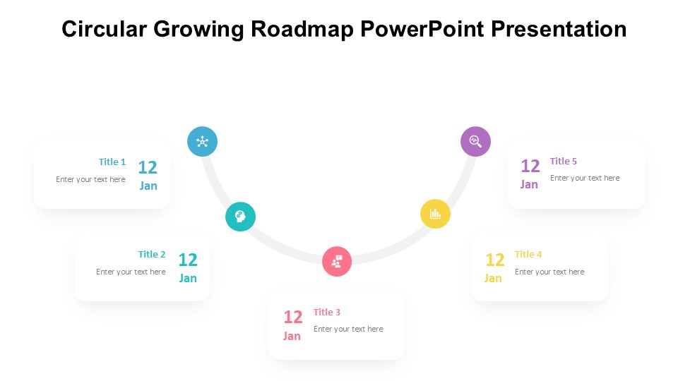 With this presentation template, users can easily map out their goals, key initiatives, and timelines in a clear and organized manner. The circular layout allows for a sequential and visually appealing display of information, making it ideal for showcasing growth projections, project plans, and strategic roadmaps to stakeholders, clients, or team members.