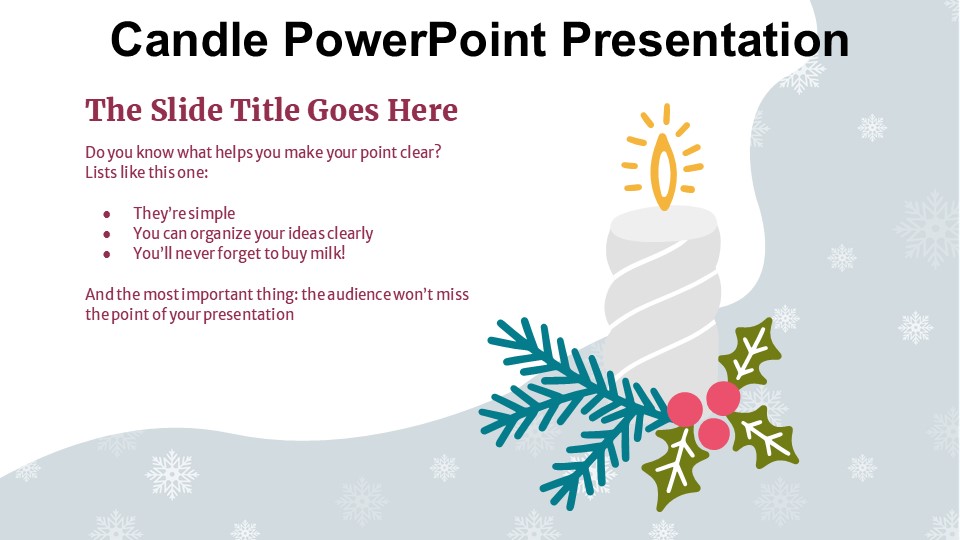 The layout of the Candle PowerPoint Presentation is clean and easy to navigate, with placeholders for text and images that can be easily customized to suit your needs. The template also includes a variety of slide designs, such as title slides, section breaks, and charts, to help you organize your content effectively.