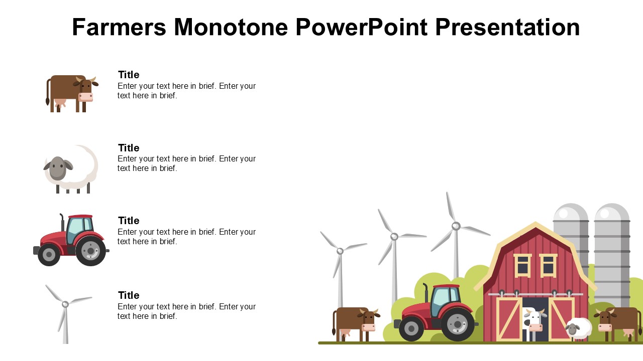 The Farmers Monotone PowerPoint Presentation template is perfect for agriculture professionals looking to create visually appealing slideshows. This versatile template features a clean and modern design with a monotone color scheme, making it suitable for a wide range of farming-related presentations.