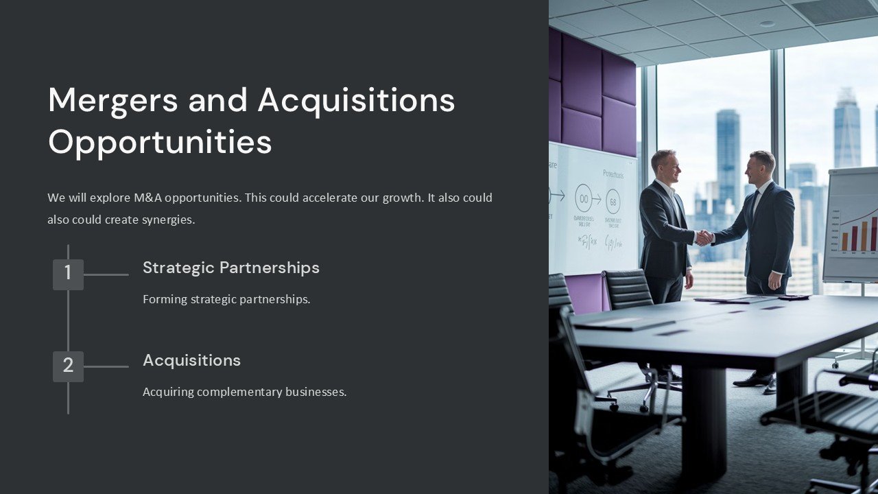 In the dynamic world of business, staying ahead means not only keeping pace with current trends but also anticipating future opportunities. The Mergers and Acquisitions Opportunities PowerPoint Presentation is your go-to resource for presenting, analyzing, and strategizing potential M&A opportunities. Tailored for business strategists, financial analysts, and corporate executives, this comprehensive PowerPoint template offers a systematic approach to present intricate M&A scenarios in a digestible format.
