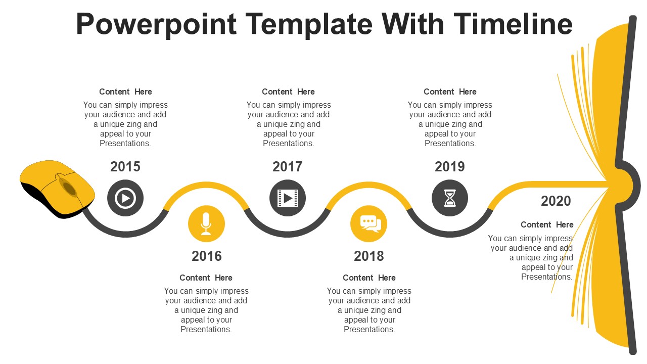 The Powerpoint Template With Timeline features a clean and modern design that is fully customizable to suit your specific needs. With a variety of slide layouts to choose from, you can easily add your own text, images, and data to create a timeline that effectively communicates your message. The template also includes creative graphics and icons that can be used to enhance the visual appeal of your timeline.