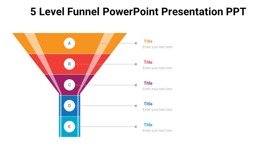 This PowerPoint presentation includes five levels of the funnel, each representing a different stage of the process. Whether you are outlining a sales strategy, showcasing a marketing campaign, or visualizing a workflow, this template is versatile enough to suit a variety of needs. The clean layout and easy-to-read text ensure that your message will be conveyed clearly and effectively.
