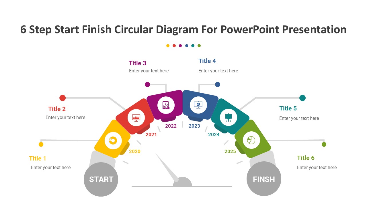 Features of the 6 Step Start Finish Circular Diagram for PowerPoint Presentation include fully editable templates that allow you to: