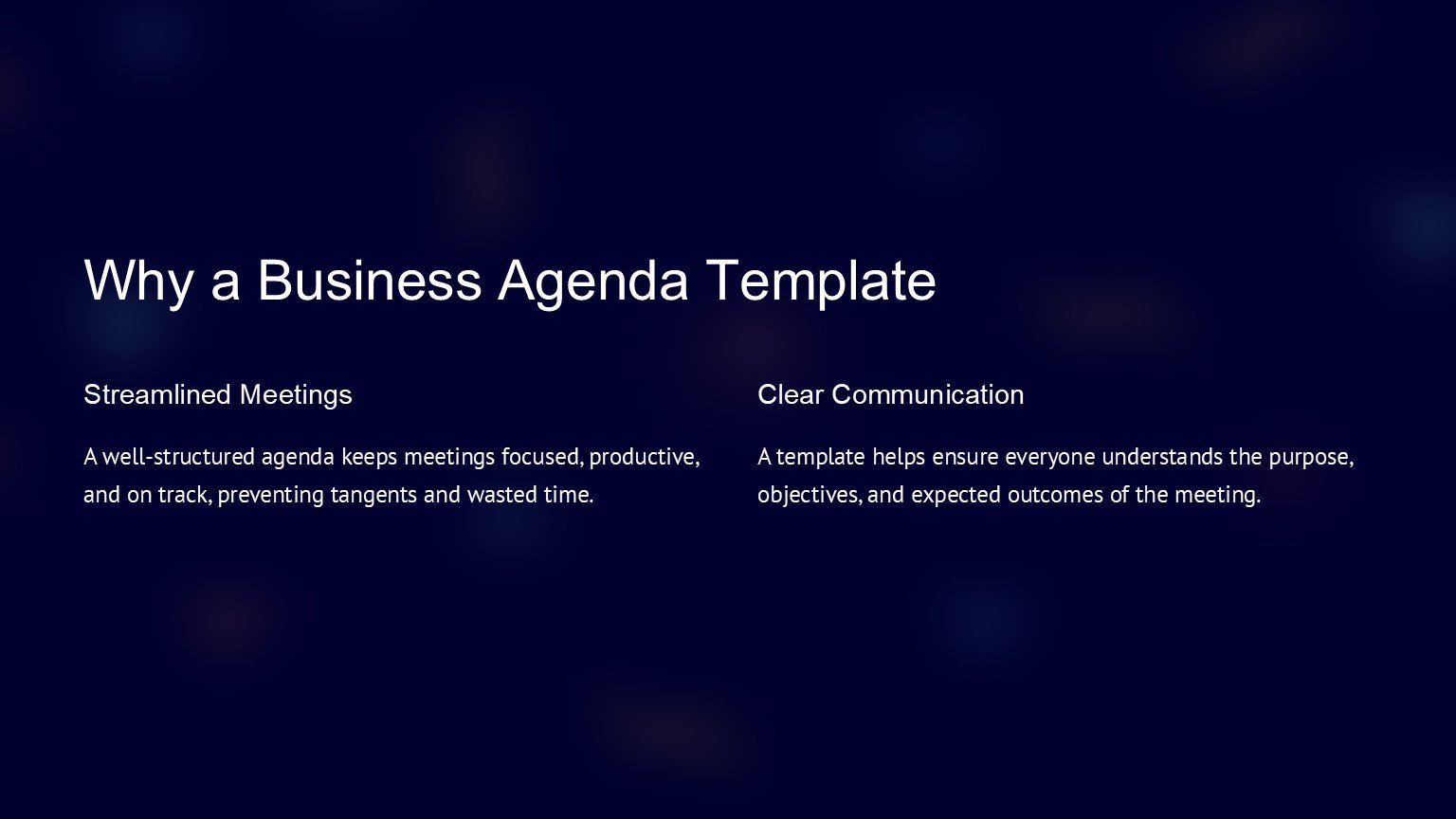 Overall, the Business Agenda PowerPoint Template is a versatile and user-friendly tool that will elevate your business presentations and help you communicate your agenda with clarity and style. With its fully editable templates and customizable features, this template is a must-have for anyone looking to streamline their business meetings and events.