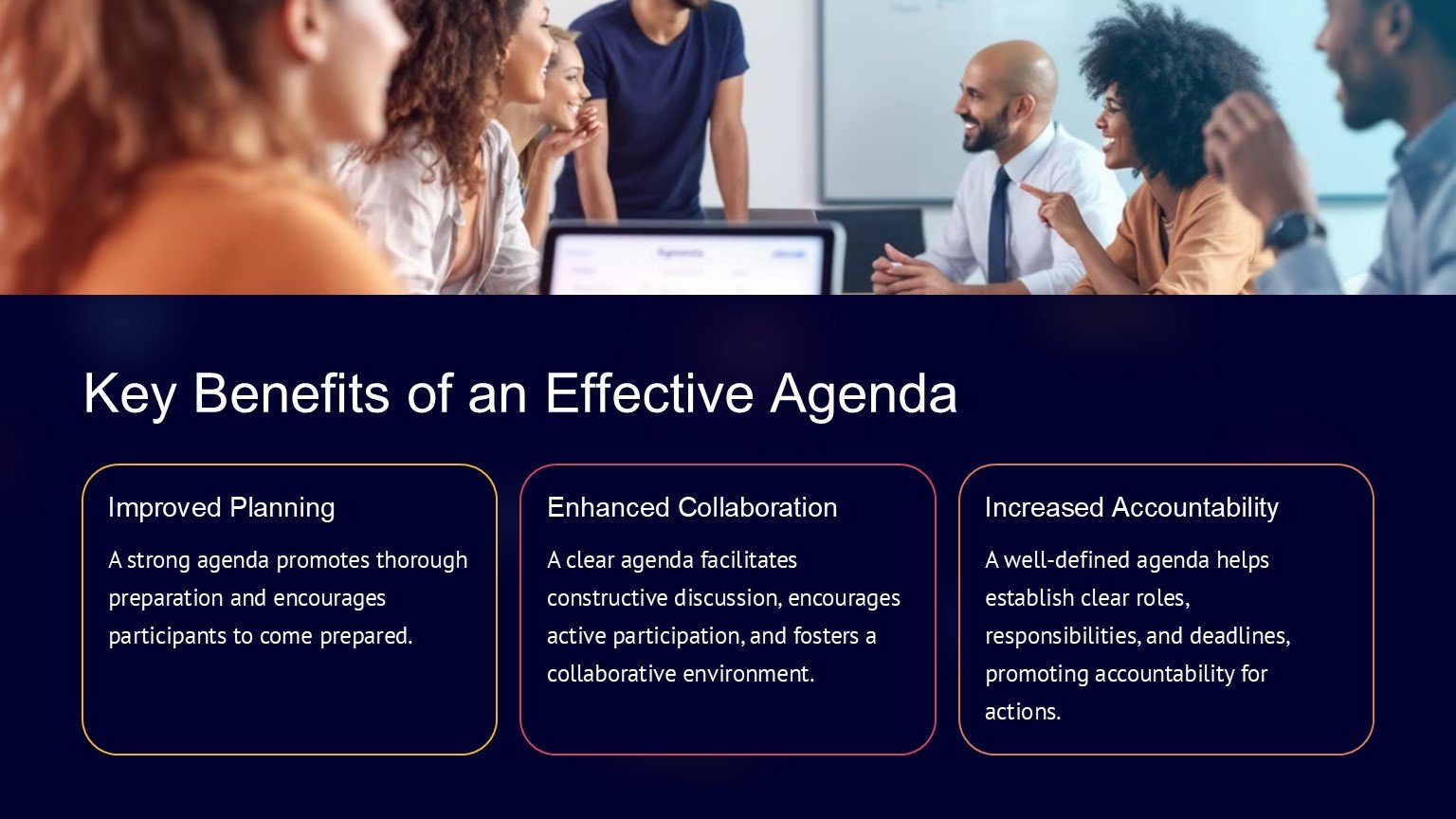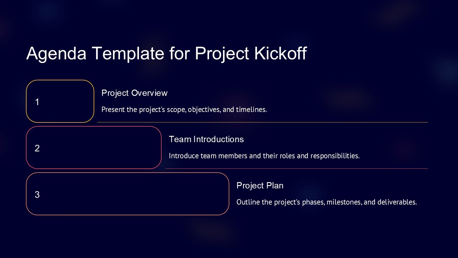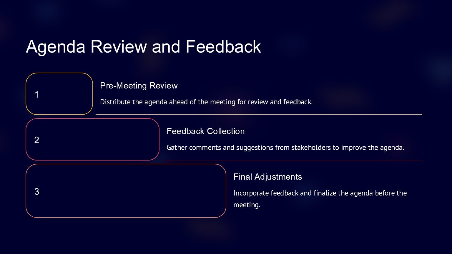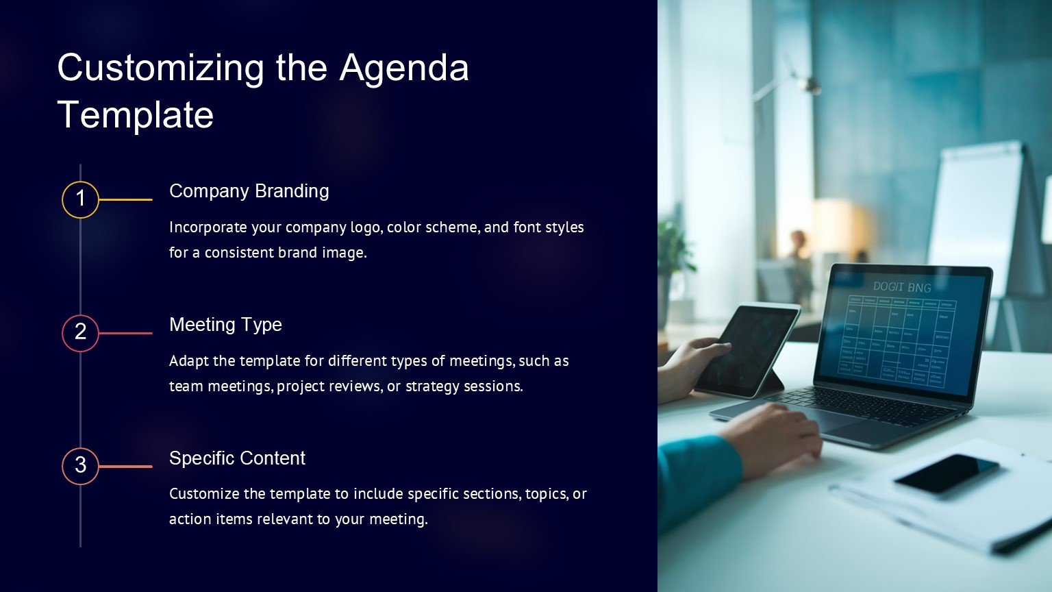 One of the key features of the Business Agenda PowerPoint Template is its fully editable design. This means that you can customize the colors, fonts, and layout of the slides to suit your brand or personal preferences. You can also add or remove agenda items, adjust the timeline, and rearrange the slides to create a customized agenda that meets your specific needs.