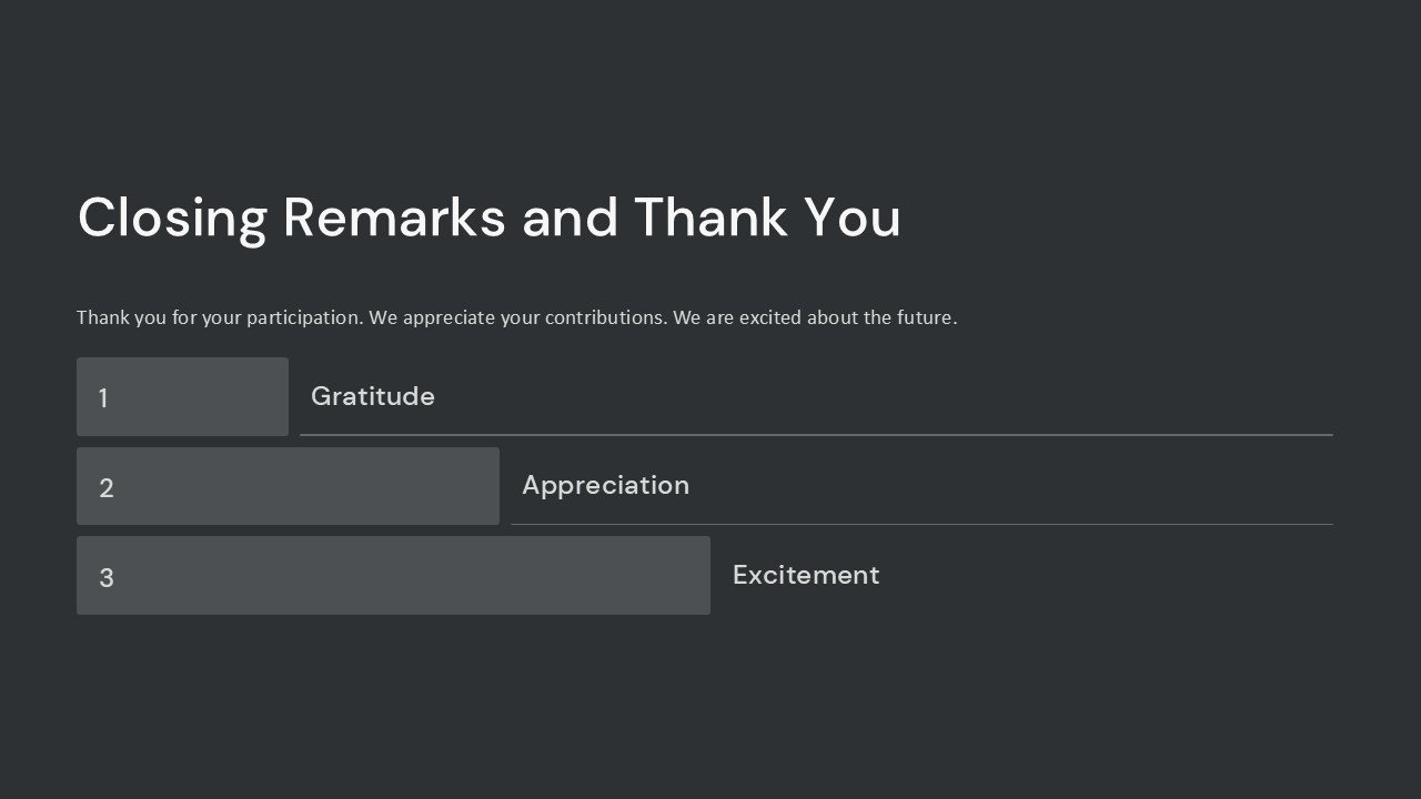 Crafted with meticulous attention to detail, this presentation template offers a range of slides that elegantly guide you through the process of delivering effective closing remarks and heartfelt thank you messages. Each slide features a clean, modern design that emphasizes clarity and professionalism, allowing your content to take center stage.