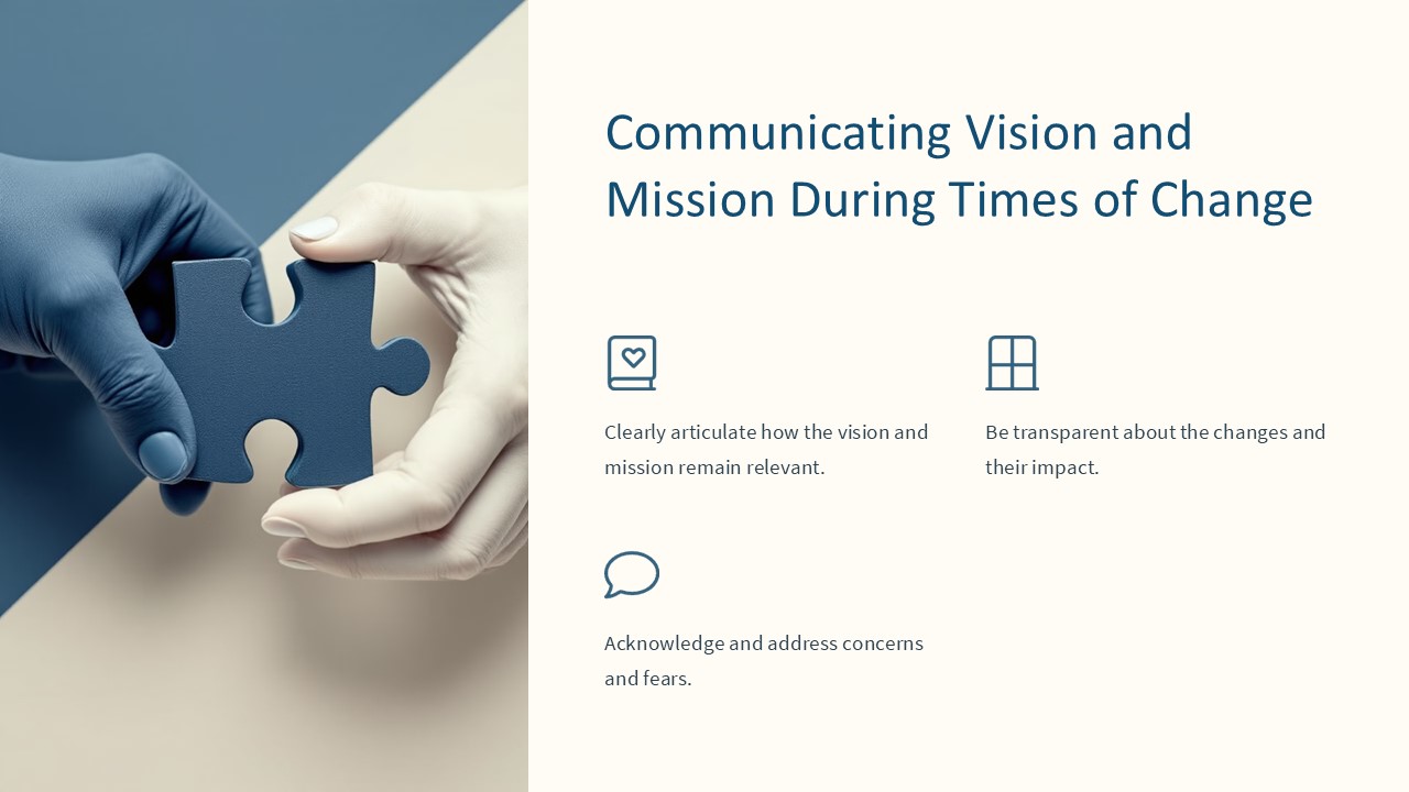 3. Comprehensive content: The presentation covers all essential aspects of communicating vision and mission during times of change, providing a thorough guide for users.