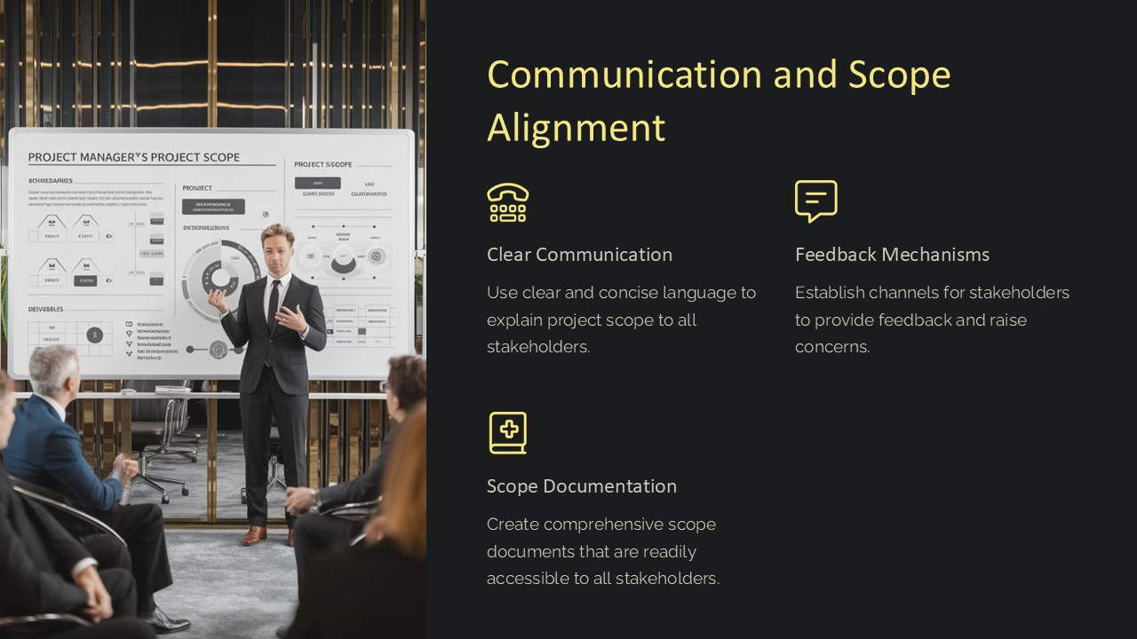 With a sleek and modern design, this PowerPoint presentation includes an array of slides that cover various aspects of communication and scope alignment. From defining project scope and objectives to outlining communication strategies and techniques, this template provides a comprehensive guide to help teams stay on track and work towards a common goal.