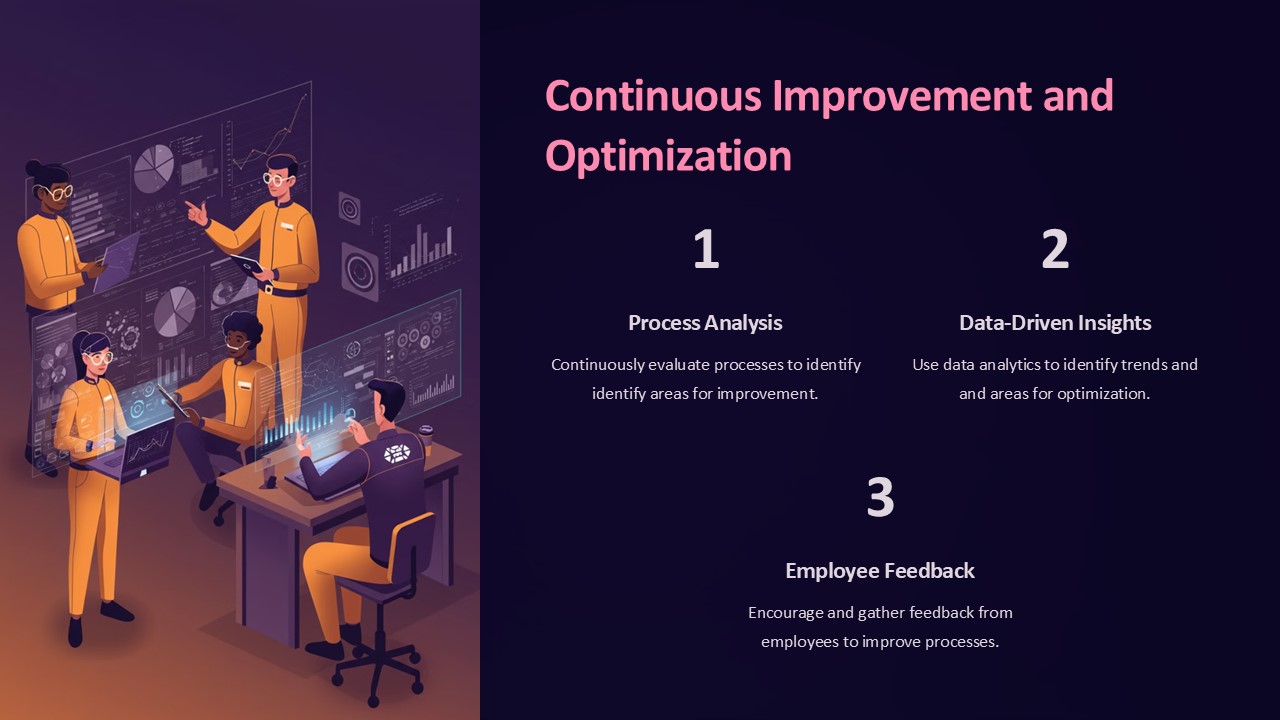 With a clean and modern design, this PowerPoint presentation covers key topics such as the principles of continuous improvement, strategies for optimization, tools and techniques for monitoring progress, and real-life case studies of successful implementation. The deck also includes customizable diagrams, charts, and graphs to help visualize complex concepts and data.
