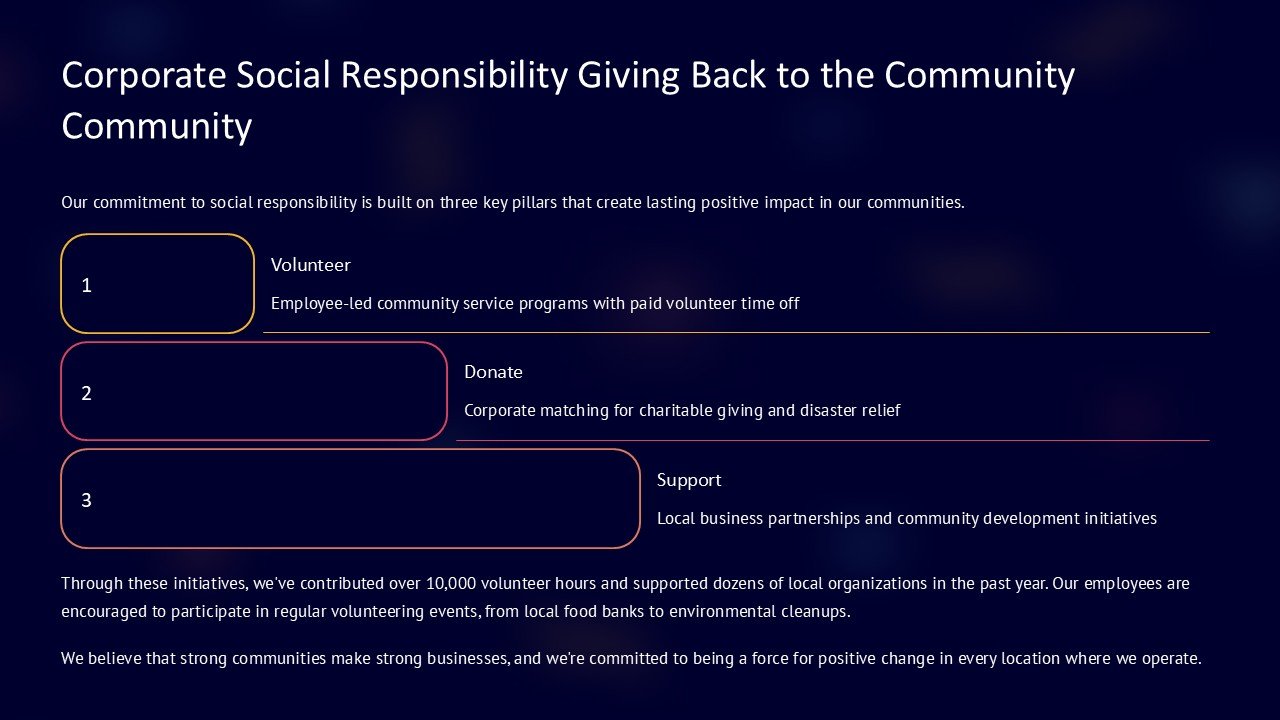 6. **Inspirational Quotes and Messaging:** Integrate powerful quotes and messages that resonate with the theme of giving back. This feature is designed to inspire and motivate your audience, reinforcing the importance and impact of CSR efforts.