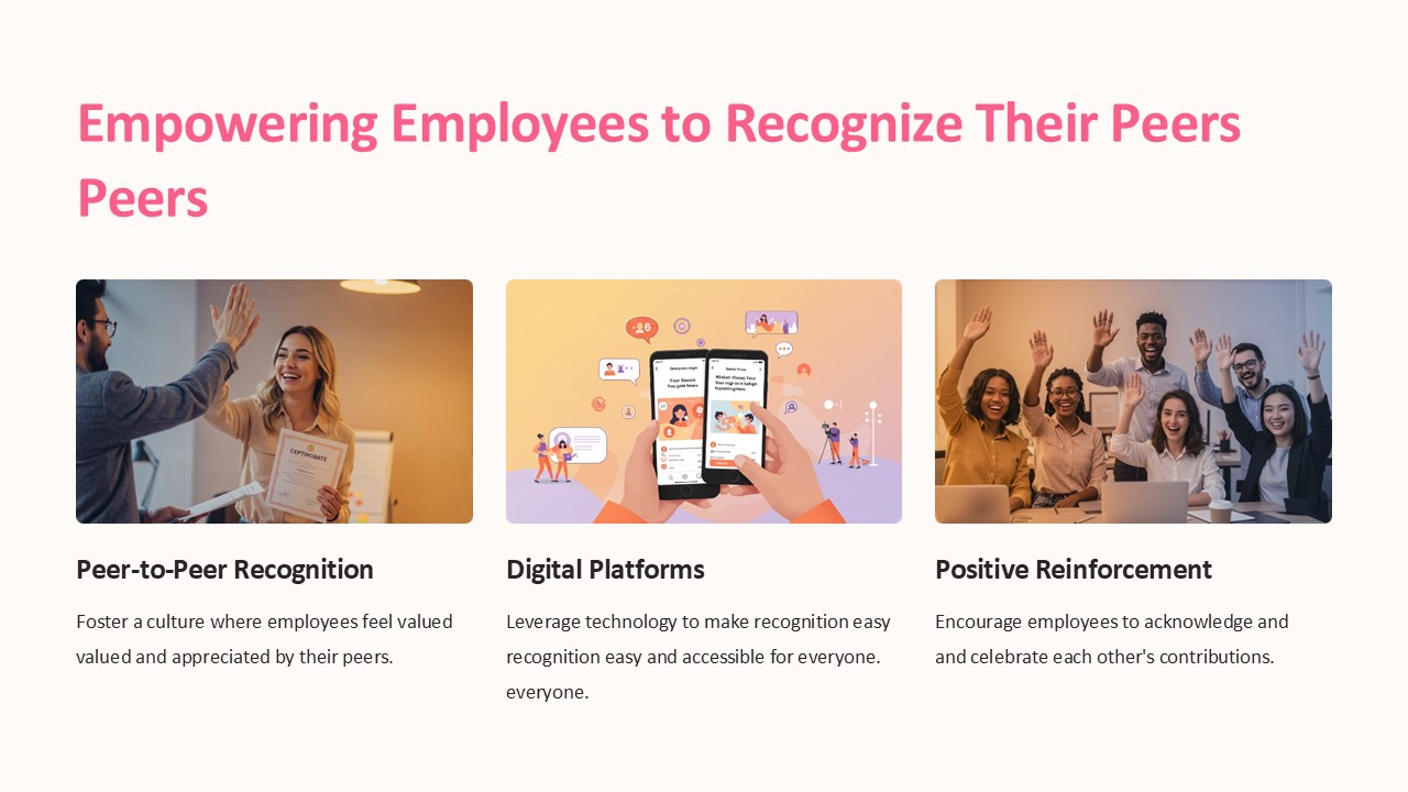 – Comprehensive information: Covering the benefits of peer recognition, best practices for implementing recognition programs, and strategies for encouraging employee engagement.