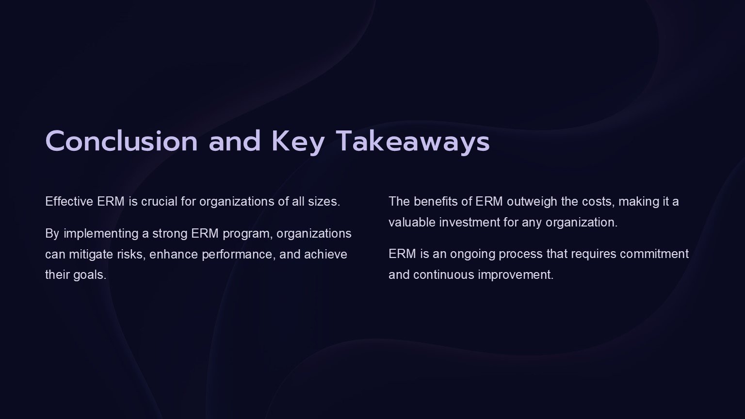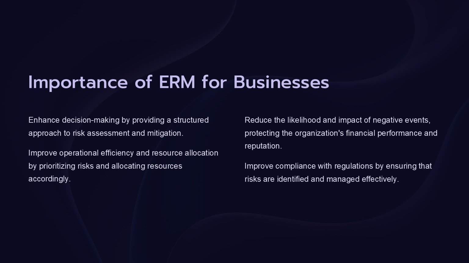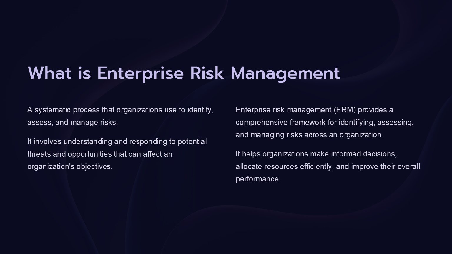 Whether you are looking to educate your team on ERM best practices, present risk management strategies to stakeholders, or conduct training on risk assessment methodologies, this template has got you covered. With its easy-to-use and customizable features, you can create professional-looking presentations that effectively communicate your organization’s approach to managing risks.