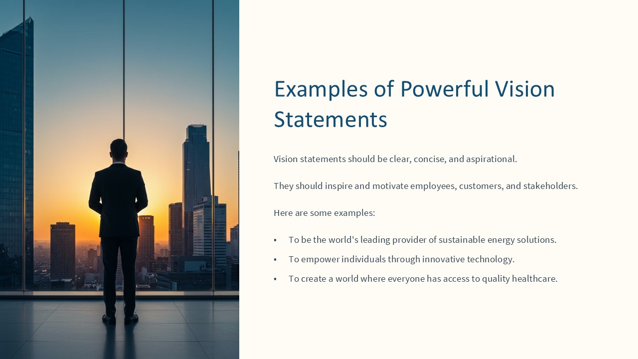 Examples of Powerful Vision Statements PowerPoint Presentation is a professional and beautifully designed template that showcases a collection of inspiring vision statements from successful companies across various industries. This presentation serves as a great resource for businesses looking to create or refine their own vision statement.