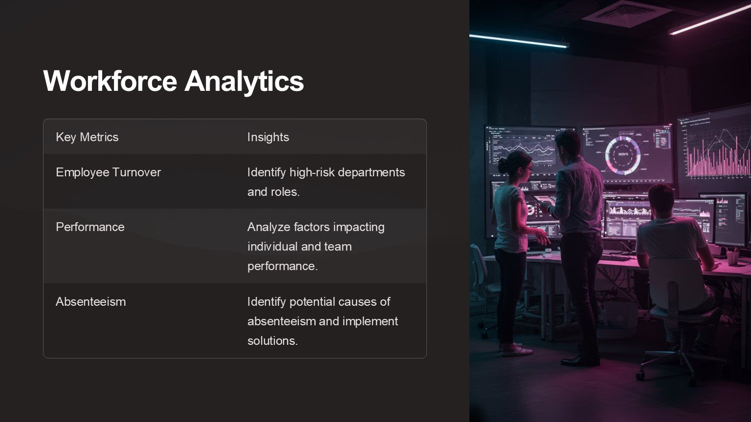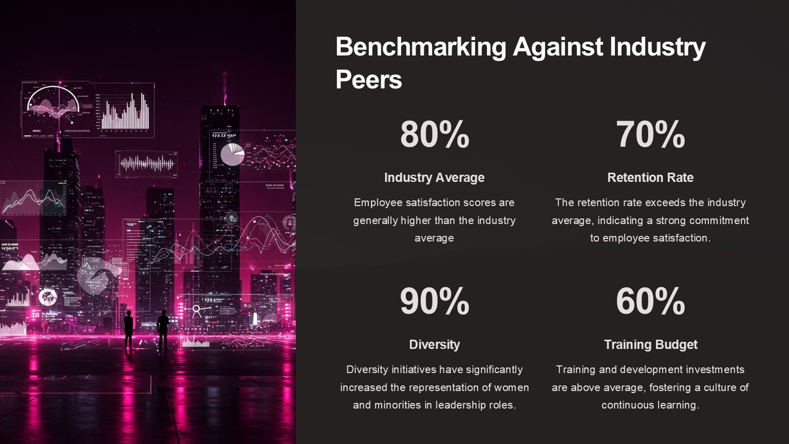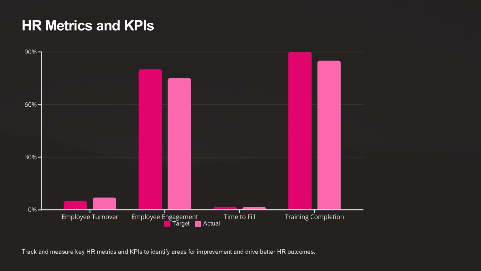 The template features a clean and modern design, with a focus on presenting data in a clear and concise manner. It includes a variety of slide layouts, such as charts, graphs, tables, and infographics, to help visualize HR data and trends effectively. Whether you need to showcase employee engagement metrics, turnover rates, recruitment statistics, or training progress, this template has you covered.