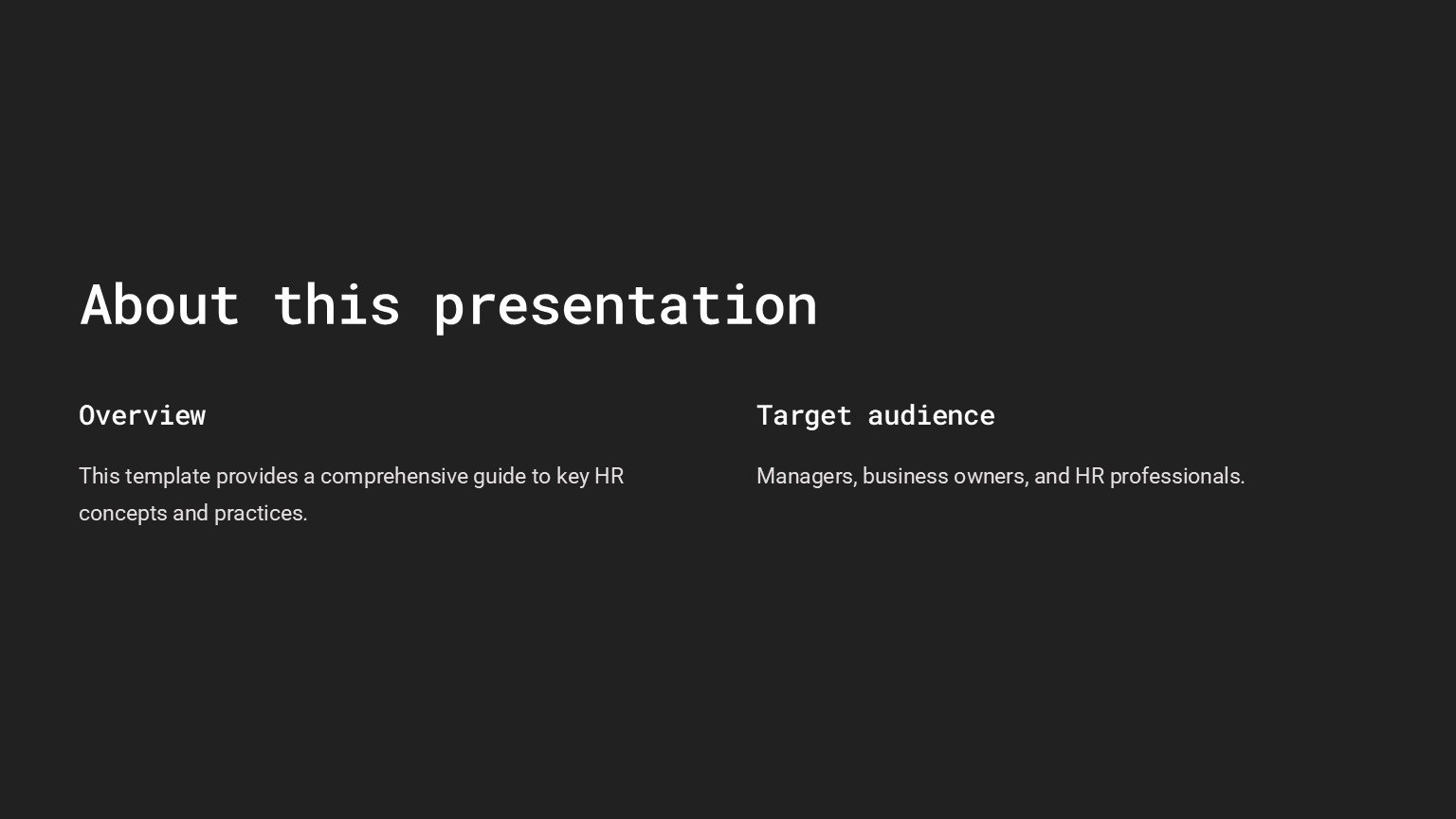 The template features a clean and modern design with a focus on HR-related topics. It includes a variety of customizable slides that cover key areas such as recruitment, employee onboarding, training and development, performance management, and HR analytics. Whether you are delivering a presentation to your team, senior leadership, or stakeholders, this template will help you convey your message in a clear and engaging manner.