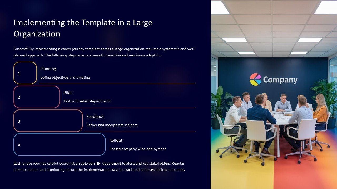 1. **Fully Editable Templates:** Every slide in the “Implementing the Template in a Large Organization” presentation is fully editable. You have the freedom to change the backgrounds, edit the text, modify shapes, and rearrange the layout to suit your specific requirements.