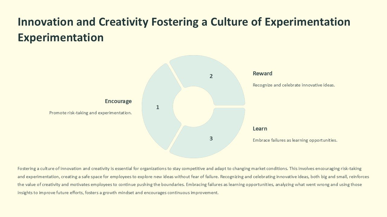 Spanning a diverse range of slides, each aspect of fostering a culture of experimentation is covered in detail. From introductory slides that define what innovation and creativity mean in the context of your business, to complex discussions on how to implement a sustainable experimental culture, this presentation has it all. Engage your audience with compelling statistics, insightful case studies, and interactive elements that encourage participation and thought.