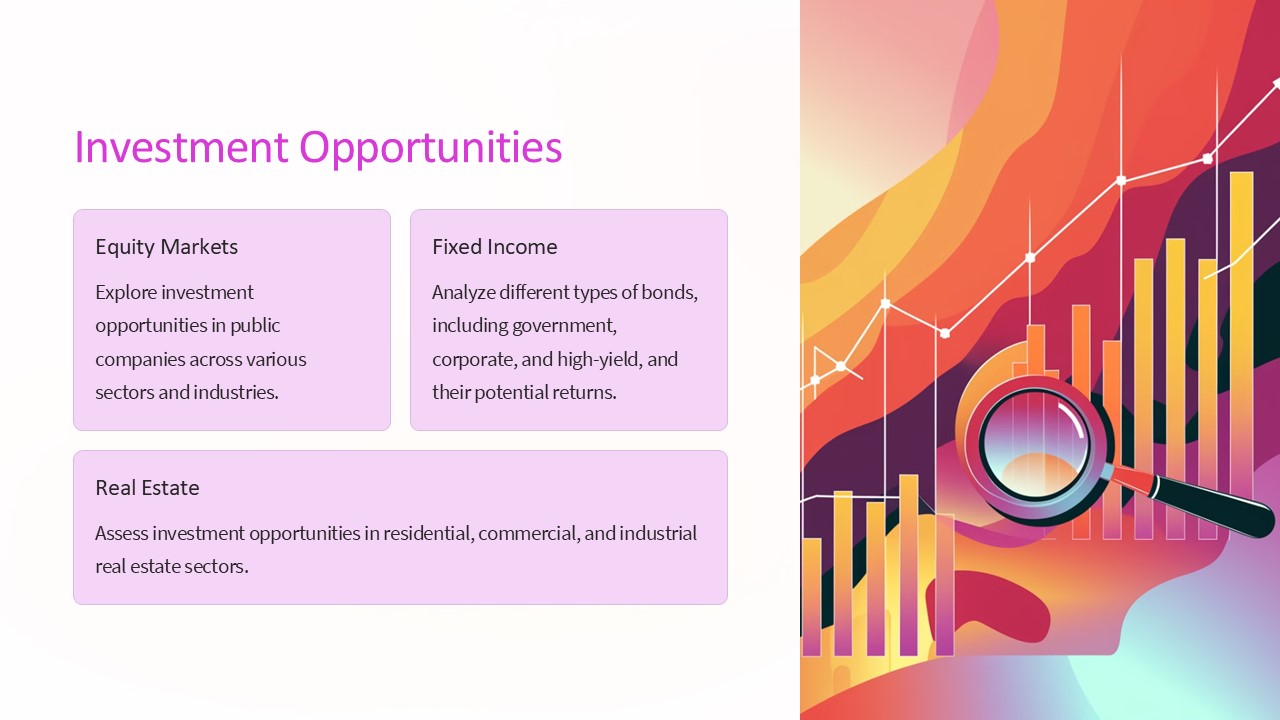 Take your investment presentations to the next level with our Investment Opportunities PowerPoint Presentation template. Download now and start creating impactful slides that will leave a lasting impression on your audience.