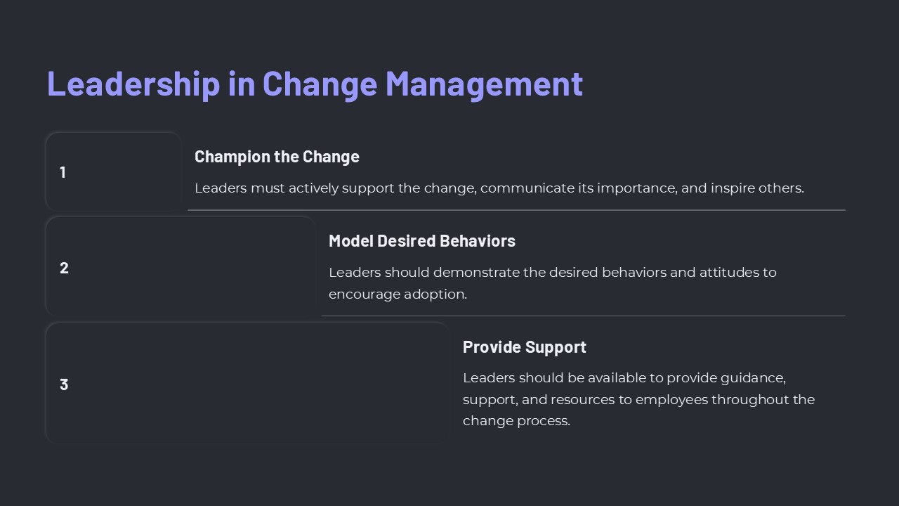 4. Comprehensive coverage: The presentation covers key aspects of leadership in change management, providing a thorough overview of the topic.