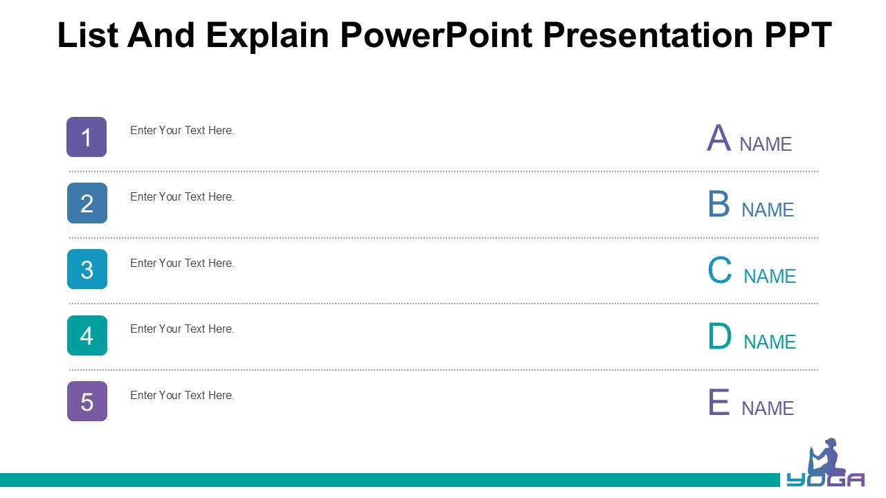 The List And Explain PowerPoint Presentation PPT template offers a wide range of slide designs that are easy to customize to fit your specific needs. Whether you’re looking to showcase data, highlight key points, or simply present information in a clear and organized manner, this template has got you covered. With its sleek and modern design, your presentation is sure to stand out and leave a lasting impression.