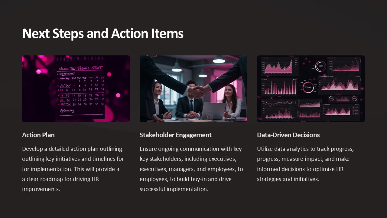Next Steps and Action Items PowerPoint Presentation is a professional and sleek template designed to help you outline the key actions that need to be taken after a meeting, project, or decision has been made. This template is perfect for business meetings, project reviews, and team presentations.