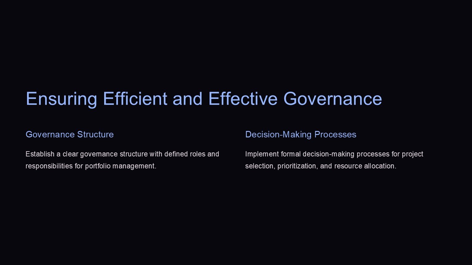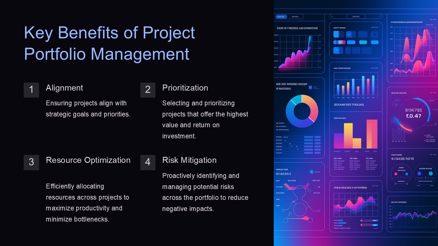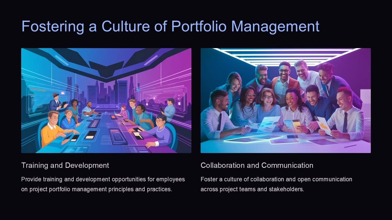 1. Comprehensive slide designs for presenting project portfolio objectives, strategies, timelines, and progress reports.