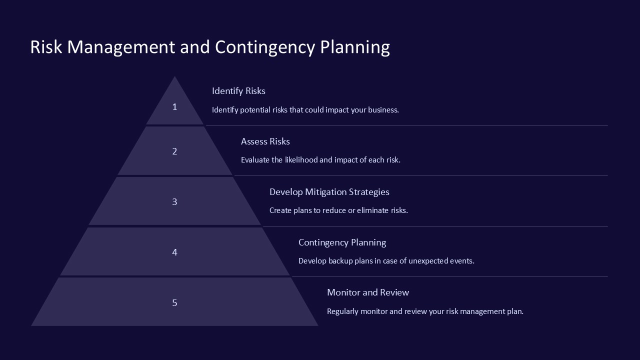 This professionally designed PowerPoint presentation includes a range of slides that cover various aspects of risk management and contingency planning. From risk identification and assessment to developing risk mitigation strategies and creating contingency plans, this template has everything you need to stay ahead of potential threats to your business.