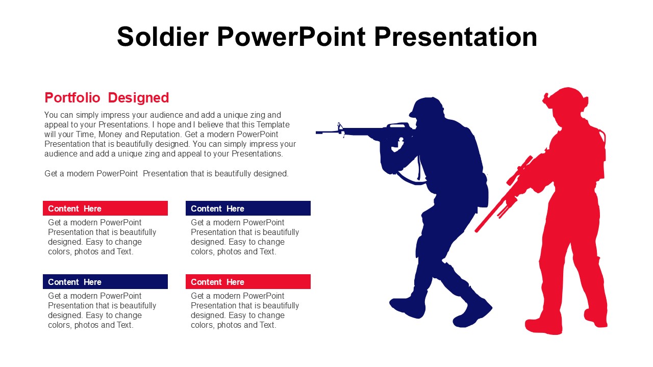 This PowerPoint presentation features high-quality graphics, image placeholders, and text boxes that are fully editable, allowing you to customize the content to suit your needs. Whether you need to present complex data, project timelines, or organizational charts, the Soldier PowerPoint Presentation has got you covered. The template includes slides for introducing key team members, highlighting accomplishments, and outlining future objectives.