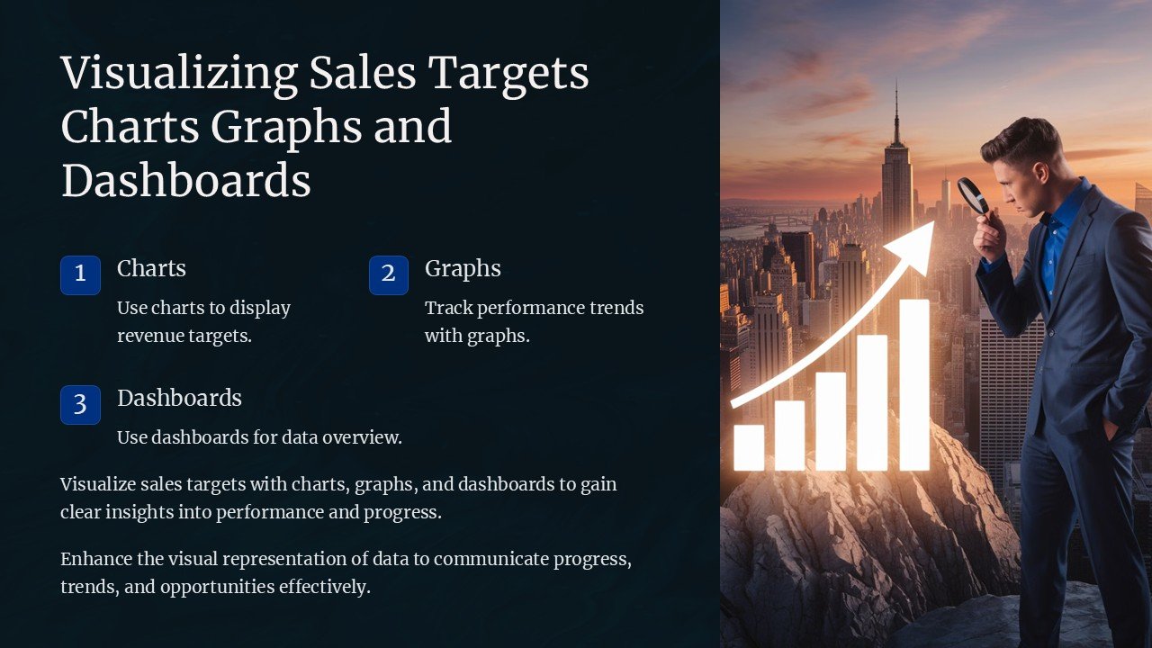 Introducing the Visualizing Sales Targets: Charts, Graphs, and Dashboards PowerPoint Presentation, a comprehensive toolkit designed for professionals who aim to present their sales data in a clear, impactful, and visually appealing manner. This dynamic presentation package is tailored to meet the needs of sales managers, business analysts, marketing teams, and executives who require a detailed and understandable display of sales figures and forecasts.