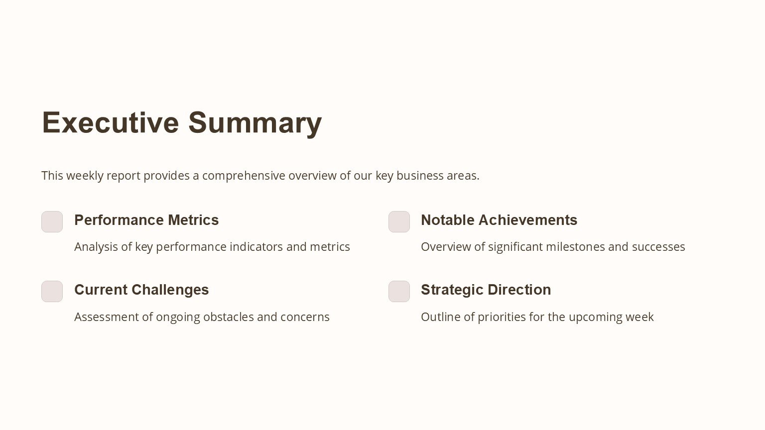 – Versatile slide layouts: Choose from a variety of slide layouts to structure your weekly report effectively.